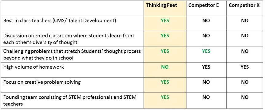 At Thinking Feet, our focus is more on conceptual understanding and application of Mathematics concepts to solve problems at grade level....sometimes going to higher grade levels. We do not believe in cramming young minds, instead we focus on building learning aptitudes and creativity in problem solving. We believe that in the long term, the ability to deconstruct problems and figuring out creative solutions has a much deeper and positive impact on students' development.
